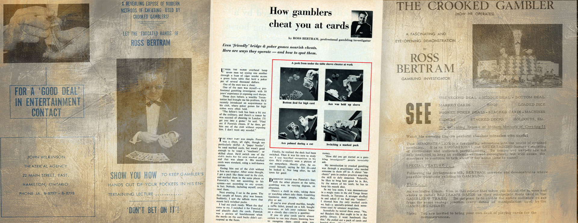 Here is the gambling exposé article by Ross Bertram that was featured in Variety magazine in February 1963: “How Gamblers Cheat You at Cards.” Ross was billed as a professional gambling investigator and explained with great clarity how “even friendly bridge and poker games nourish cheats. Here are ways they operate — and how to spot them.”