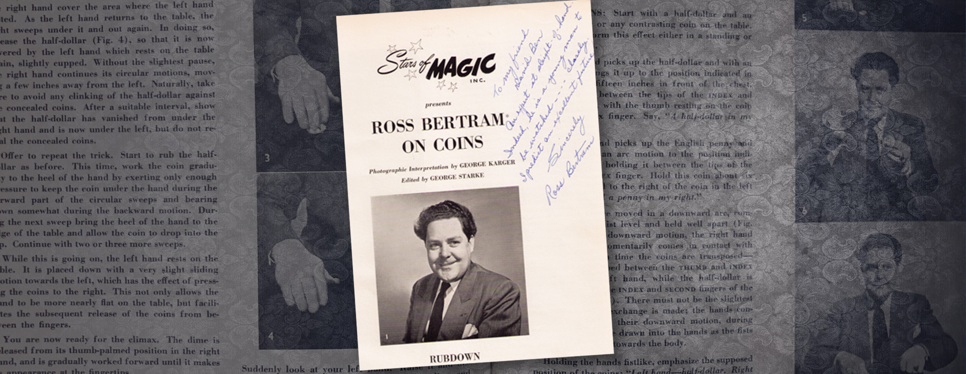 When Vernon returned to New York, he spread the word about Ross Bertram and his coin work to magic’s cognoscenti. Ross soon received a letter from George Starke informing Ross of his plans for the Stars of Magic. Starke invited Ross to contribute some of his pet coin effects to the series. Ross accepted the invitation and traveled to New York on three separate occasions to have his tricks photographed by George Karger. Ross’s good friend from Toronto, Norm Houghton, ghost wrote the text for the installment.