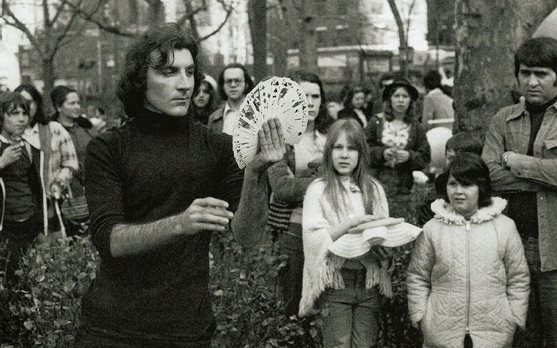 Busking is an ancient craft; one of the earliest depictions of a magician performing the Cups and Balls on the street is “The Conjuror” by Hieronymus Bosch, painted in 1502. But busking was unknown on the streets of New York City in the late 1960s when magician Jeff Sheridan began performing regularly at the Walter Scott statue in Central Park. Street performers were often treated as criminals in those days, and were constantly harassed and often arrested by police.