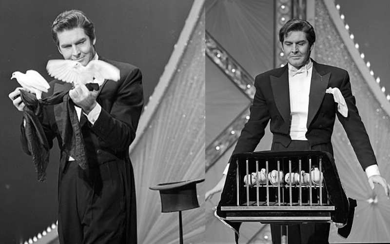 Here is an older version of the act, recorded in black-and-white in 1956. The music aside, this is almost the same act as presented in European Nights, except that in this performance, we see his actual finale. In reality, the Dove to Silk was usually the penultimate effect, and not the closer as depicted in European Nights. Also note that in this clip, you can see the smile that the otherwise aloof Pollock allows to appear only when it came time to accept his final applause.