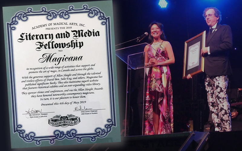 On May 4, 2019, Magicana received the 2018 Literary and Media Fellowship from the Academy of Magical Arts at the legendary Magic Castle in Hollywood. What a true honour it is to be recognized by the Academy with this prestigious award, and to join the impressive list of past honourees. This award not only validates our efforts, but it also represents the acknowledgement of our peers of our work and our contributions. And most importantly, it is recognition that what we are doing is making a difference in raising the profile of magic—an art we love so much.